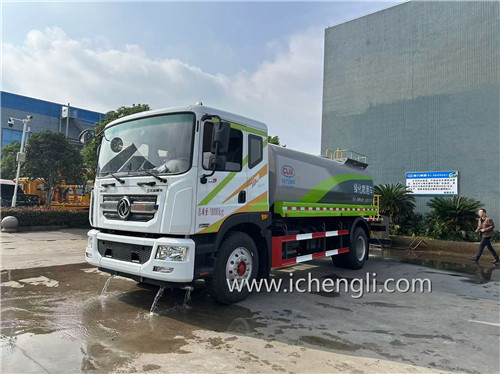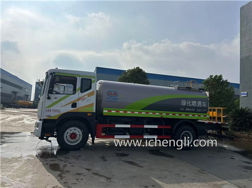 根據客戶要求:罐體容積約14.3立方。新款工藝流水線標準化生產灑水車,大氣,漂亮!專用功能為:前沖后灑,帶側噴,罐體后帶工作平臺,平臺上安裝綠化灑水高炮,灑水炮可全方位旋轉,并有多種雨狀可調節(大雨、中雨、毛毛雨、霧狀),泵可自吸自排,帶自流閥,帶消防接頭,帶過濾裝置。車輛交付客戶特別滿意!感謝信任!