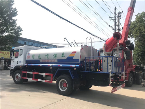 根據客戶要求:罐體容積約12立方;專用功能為:前沖后灑,帶側噴,帶高位花灑,罐體后帶工作平臺,平臺上安裝綠化灑水高炮,灑水炮可全方位旋轉,并有多種雨狀可調節(大雨、中雨、毛毛雨、霧狀),泵可自吸自排,帶自流閥,帶消防接頭,帶過濾裝置。后平臺加大安裝30型柴油發電機組全自動霧炮噴霧機組,遙控操作,工地拆遷,降塵,園林綠化,花卉植物噴藥皆可使用。