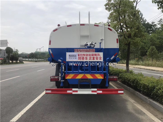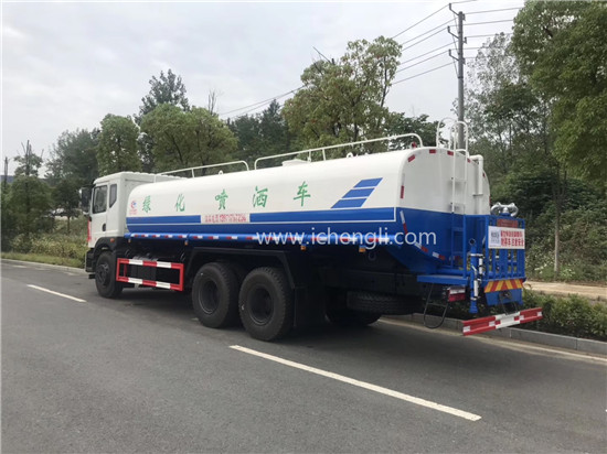 根據客戶要求:罐體容積約20立方;專用功能為:前沖后灑,帶側噴,帶高位花灑,罐體后帶工作平臺,平臺上安裝綠化灑水高炮,灑水炮可全方位旋轉,并有多種雨狀可調節(大雨、中雨、毛毛雨、霧狀),泵可自吸自排,帶自流閥,帶消防接頭,帶過濾裝置。