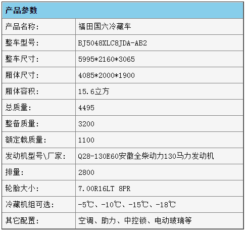 六、選裝配置:可選裝廂體側門(單側門或雙開門),可選裝鋁合金導風槽(導風槽有助于冷氣循環,提升制冷效果),可選裝廂體頂部加固肉勾滑道(直滑道 或 對接互通式拐彎滑道)。可選裝廂體內部采用全面不銹鋼材質(海鮮運輸必須加裝,海水有腐蝕性),可選裝280V-380V外接電源(停車熄火后可插電冷機繼續制冷工作),可選裝溫濕度監控記錄儀(帶打印功能)。