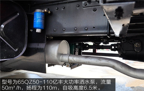 東風145灑水車選用型號為65QZ50-110億豐大功率灑水泵,流量50m³/h,揚程為110m,自吸高度6.5米。灑水泵緊鄰排氣管,該車為國四排放,符合國家規定的排放標準。