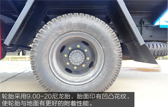輪胎采用9.00-20尼龍胎,胎面印有凹凸花紋,使輪胎與地面有更好的附著性能,防止縱、橫向滑移,增加抓地力。