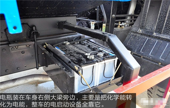 電瓶裝在車身右側大梁旁邊,主要是把化學能轉化為電能,整車的電啟動設備全靠它。