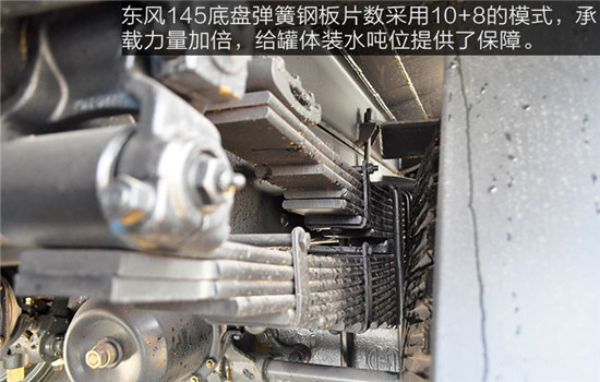 彈簧片決定了車身的承載力量,東風145底盤彈簧鋼板片數采用10+8的模式,承載力量加倍,給罐體裝水噸位提供了保障。