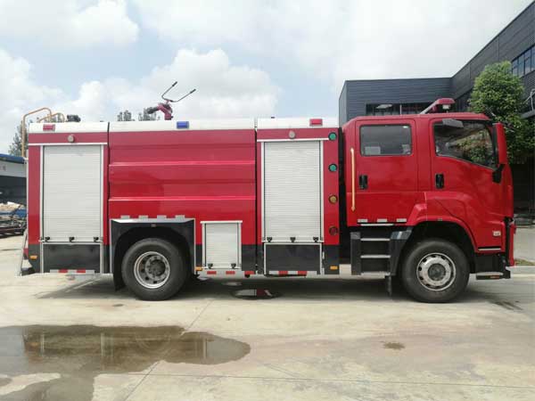 五十鈴FVR6噸泡沫消防車,位于駕乘室后部的器材箱設有鋁合金卷簾門,放置安全,拿取便捷。后爬梯選取鋁合金兩節翻轉爬梯,使用時離地不超過450mm,上車拉手選取表面帶凹槽防滑圓鋼管,表面噴塑處理。中置或者后置泵,泵房左右兩側、器材箱左右側均有新款易拉高強度鋁合金卷簾門。泵房位于車輛后部,兩邊與后邊設鋁合金卷簾門,內有照明燈,泵室兩側可放置部分常用器材。器材箱采用引進歐洲技術生產的鋁合金型材內藏式塔接技術制造,全卯接結構。采用鋁合金卷簾門。裝備CB10/40型消防泵和PL32型水-泡沫兩用消防炮。乘員室、器材箱、 泵房內均裝有照明燈,照明條件好。主框架結構采用優質方管焊接,外裝飾板采用碳鋼板焊接,車頂安裝防滑材料,可在上面行走。