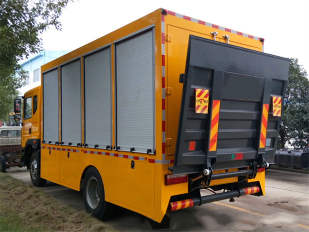 多利卡D9工程黃牌搶險救援車,本實用新型的有益效果:結構布置科學合理,綜合性、一體化程度高,非常實用。整體穩定性好,快速響應排水效率高、一體操作輕便實用、功能多樣組合便利、用途廣泛性價比高。整車底盤后部安裝2套電動支撐系統,保證車身行駛安全。可代步,可照明,可供電的功能,為夜間施工救險給予了便利。踏步選用花紋鋁板,防滑耐磨,采取壽命長。廂體使用特殊材質,整體重量輕,強度高,耐腐蝕性強。
