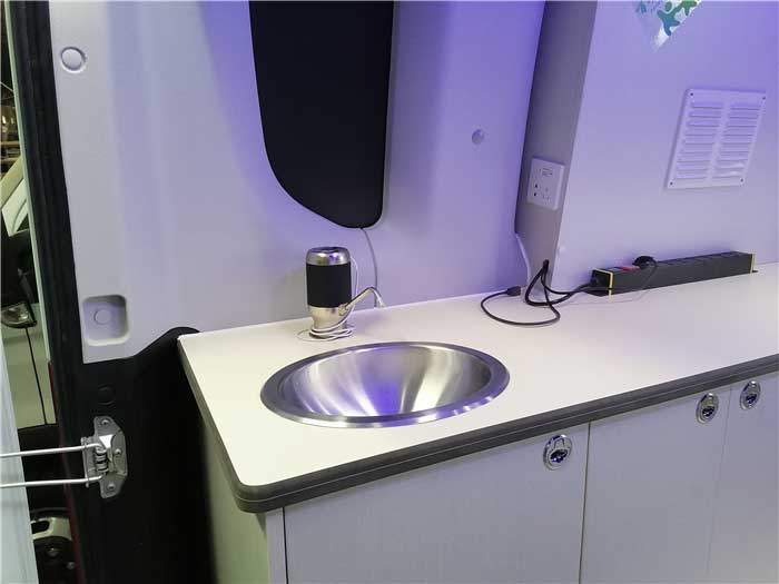 疫苗接種醫療車_依維柯歐勝高頂醫療車上裝配置:醫用空氣凈化消毒器,利用空氣過濾系統不斷的將外部空間的氣體通過進風口與過濾網和空氣凈化過濾器凈化處理后,再放回空氣中,以達到保持車內空氣潔凈的效果。頂部12V節能的LED照明燈,更環保。車輛后部的左側為疫苗冷藏區。中隔板采用高分子材料內飾,抗菌、防腐、易清洗。內頂采用高分子材料,質量好便于清洗。水龍頭是電動的,防止多人接觸,不銹鋼水池,更加耐用。