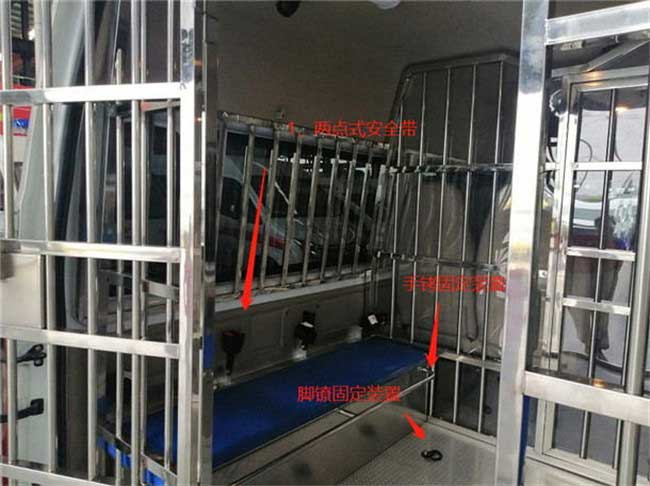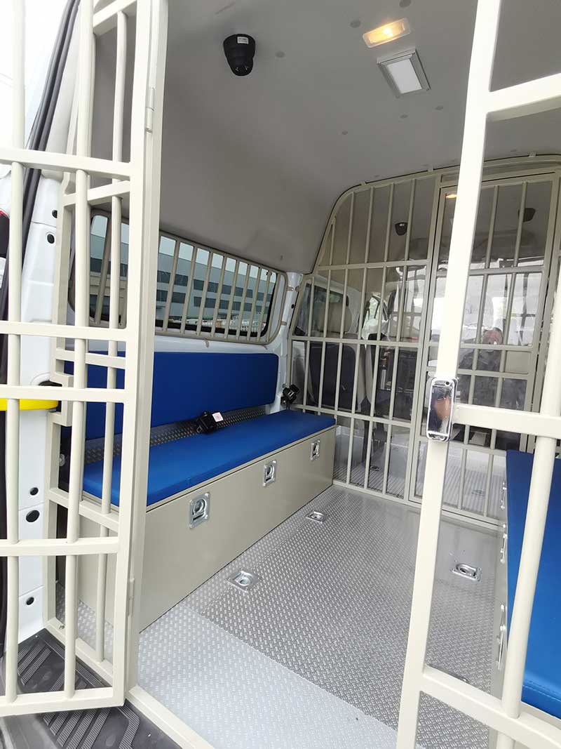 警用囚車_福特新全順V362囚車,囚籠前格柵透明有機玻璃,保證了車身的防護功能,押運更加安全。尾隔柵欄應(yīng)用不銹鋼囚籠隔斷,帶門鉸鏈及鎖止插銷,更加的緊固安全。6 個不銹鋼囚籠地環(huán),更加的堅固。中隔柵欄選取不銹鋼囚籠隔斷,開門,帶門鉸鏈及鎖止插銷,質(zhì)量更加有確保。押解區(qū)左側(cè)第一、二排雙人椅,第二排右側(cè)折疊椅,前面為7+1座;囚犯區(qū)兩側(cè)折疊長條椅,帶靠背,PVC面料,為6座。尾部加裝后踏板。監(jiān)控系統(tǒng):車輛帶錄像功能監(jiān)控系統(tǒng),押解區(qū),駕駛區(qū),囚犯區(qū)無死角監(jiān)控錄像,自動存儲時間大于等于15天以上。