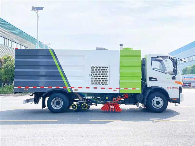 駿鈴V7_9方洗掃車實(shí)拍圖_品質(zhì)保證,洗掃車作業(yè)時(shí)先用邊刷將道牙處的垃圾向中間集中,再用高壓水進(jìn)行清洗,然后由吸口將污水及垃圾吸到污水箱中。采取PLC一鍵自動(dòng)控制系統(tǒng),人性化語(yǔ)音提示裝置,操作簡(jiǎn)潔、容易。自動(dòng)離合器驅(qū)動(dòng)風(fēng)機(jī)和高壓水泵,減少風(fēng)機(jī)啟動(dòng)和停止時(shí)對(duì)發(fā)動(dòng)機(jī)的沖擊。洗掃過(guò)的路面,有些濕潤(rùn),但并不產(chǎn)生積水,“見(jiàn)濕不見(jiàn)水”。液壓元件選用集成疊加設(shè)計(jì),駕駛室電液集中控制,操作輕易。