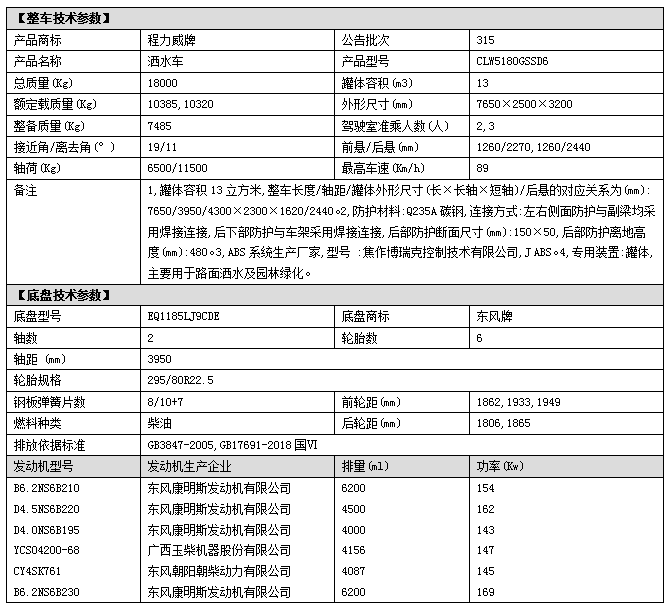 底盤配置:采用東風D9系列新款駕駛室,3950mm軸距,搭載國六(國Ⅵ)玉柴200馬力柴油發動機/康明斯210匹馬力柴油發動機,6檔變速箱,9T后橋,295真空胎,方向助力、斷氣剎、電動窗、中控鎖、ABS,原裝空調,GB7258新規。