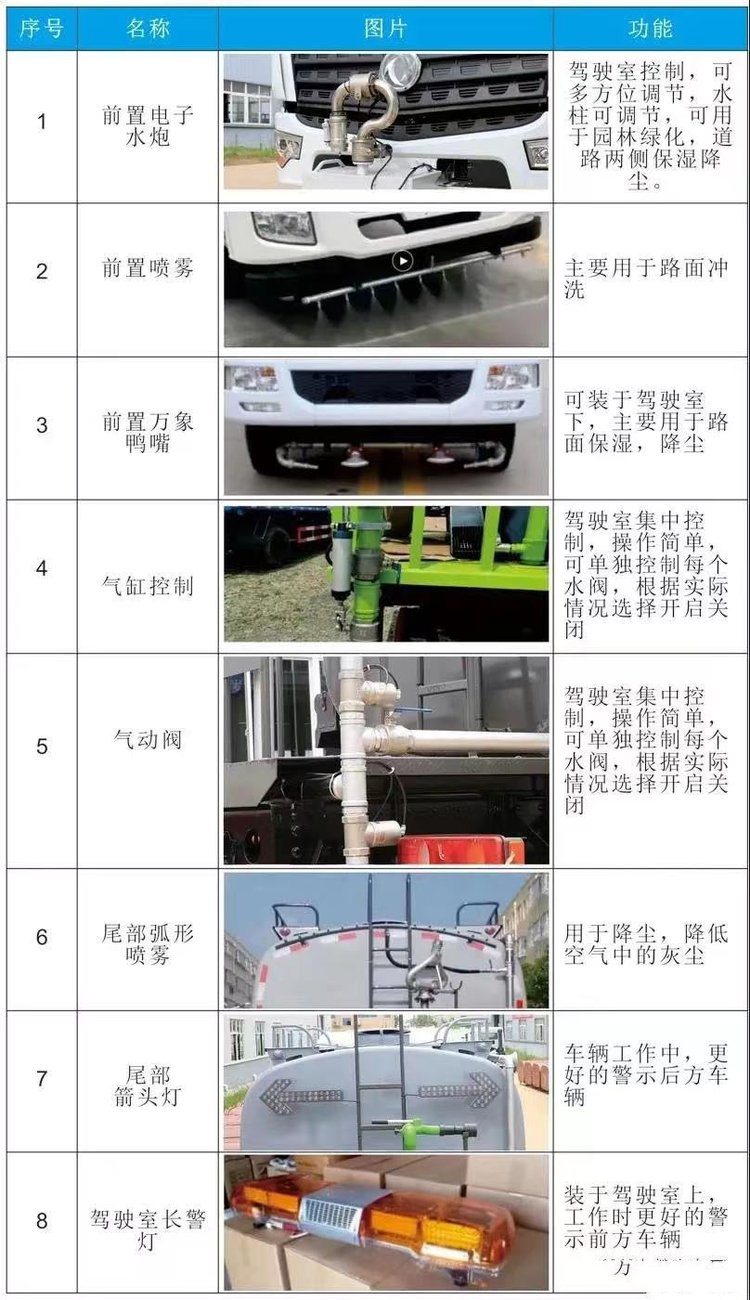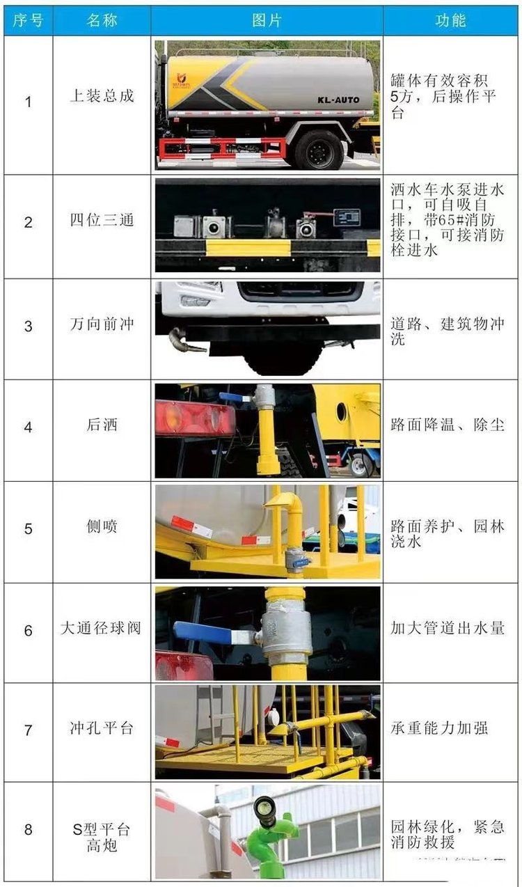 消防灑水車安裝消防車專用消防泵、消防炮、消防取力器。罐體后帶工作平臺,平臺上安裝綠化灑水炮,灑水炮可全方位旋轉,帶前沖后灑,帶側噴,可連續調成直流狀、霧狀、大雨、小雨、毛毛雨,帶安全護欄。罐體頂部安裝消防水炮。帶消防接口,可通過消防栓進水,帶自流閥,消防綠化卷盤。