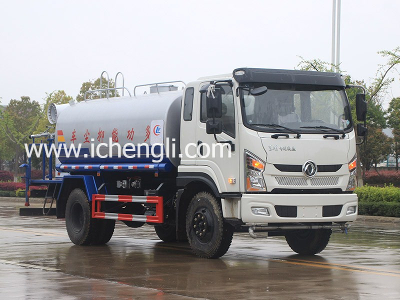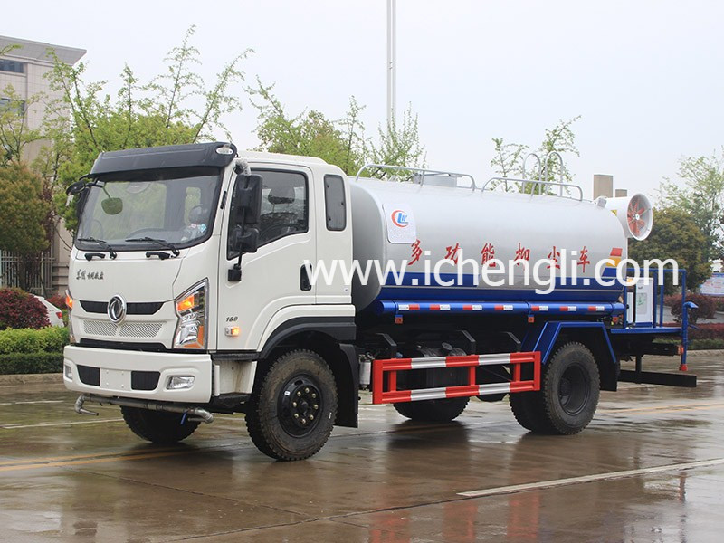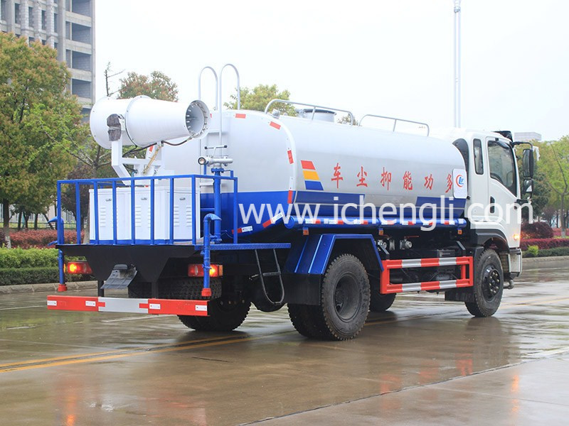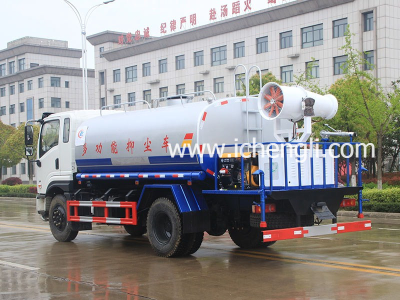 上裝配置:罐體容積:12立方,方圓罐體,罐體鋼板為4mm碳鋼Q235材質一次成型,罐內隔板具有防波作用,以減輕汽車行駛時罐體液體沖擊,配大功率專用灑水泵;前沖(噴),后灑,帶側噴,高位花灑,后置工作平臺,平臺上安裝綠化灑水炮,灑水炮可全方位旋轉可連續調成直沖狀、大雨、小雨、毛毛雨;帶安排護欄,帶自流閥,帶消防接口,自吸自排,罐前量水管(觀察罐內水位)、罐體后帶爬梯;后平臺配CLW-30型全自動柴油霧炮機組;罐體顏色:銀灰銀藍,罐體表面雙層油漆工藝,防銹、耐腐蝕,其他標配。