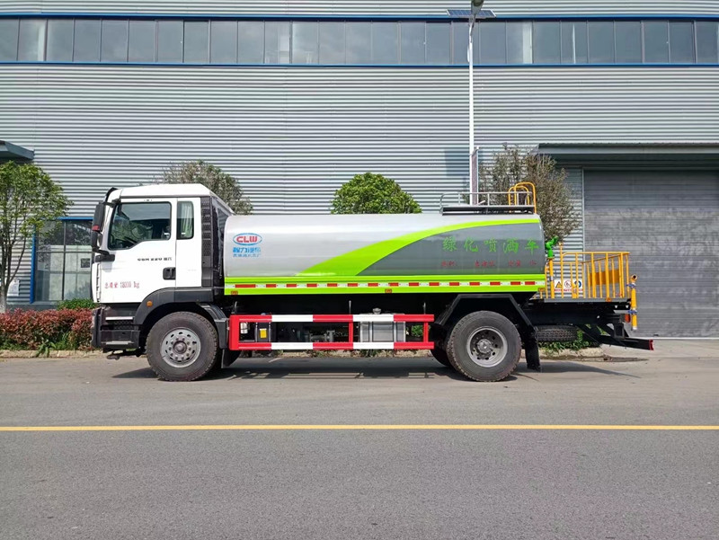 重汽汕德卡灑水車,G5M駕駛室,容積:12立方,濰柴220馬力發動機,軸距4500mm,重汽八檔變速箱,4.5T前橋,9T后橋,250大梁,10.00R20鋼絲胎,方向助力,斷氣剎,自動空調,氣囊座椅,電動玻璃,中控鎖,遙控鑰匙,多功能方向盤,電動調節帶加熱后視鏡;其他標配。罐體容積:12立方,整車螺栓鉚接,大口徑直通球閥,鋁合金三通,罐體材質采用4mm碳鋼Q235材質一次成型,大功率專用灑水泵,高轉速取力器,整車前沖、后灑、側噴、高位花灑,后平臺帶綠化灑水高炮,可調節直沖狀,大雨、小雨、毛毛雨、霧狀;后平臺可選裝30米、40米、50米全自動柴油霧炮機,可有效清除霧霾,降塵,環境空氣等。