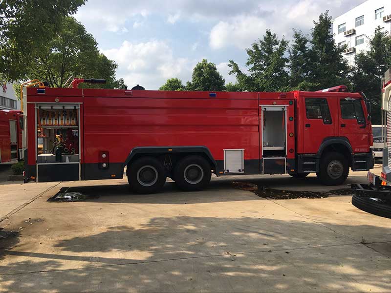 16噸泡沫消防車_重汽豪沃后雙橋泡沫消防車,器材箱內設置有儲物盒,可以放置一些小型工具。載液罐體應用的優質碳鋼材料,罐體內部應用特殊底漆噴刷,防止生銹、腐蝕。設有工具箱及卷簾門,可放置小型工具。主框架結構選取優質方管焊接,外裝飾板選取碳鋼板焊接。車內器材應用專用夾具固定,器材是由防腐蝕、防震動和防脫落的專用材料制成。