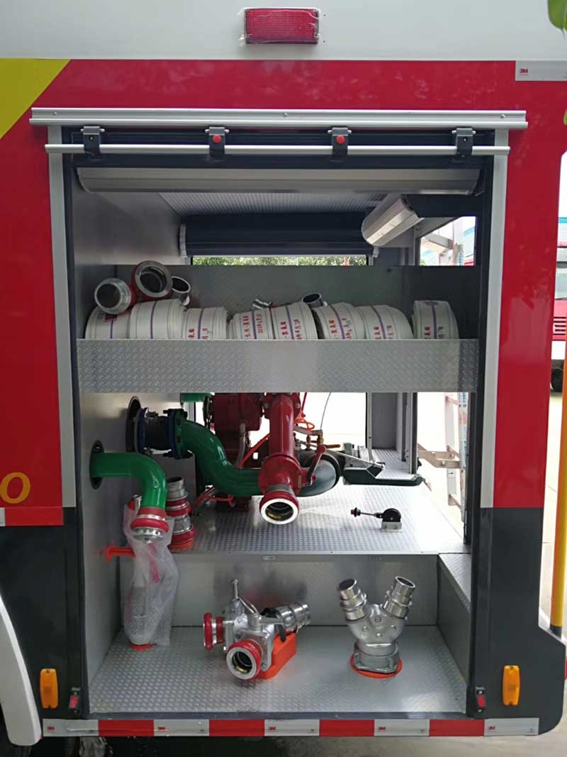 5方水罐消防車_東風多利卡D7雙排水罐消防車,車輛尾部安裝可折疊式爬梯。器材箱使用引進歐洲技術生產的鋁合金型材內藏式塔接技術制造,全卯接結構。全車兩側上方各配有2個紅藍爆閃燈及2個側照明燈。載液罐體為優質碳鋼,與底盤選取彈性連接。器材箱內設置有儲物盒,可以放置一些小型工具。駕乘室后部設置的器材箱安裝有鋁合金卷簾門,內設有照明,物品拿取利于。