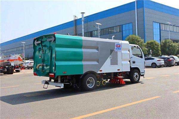 多利卡D6_6方洗掃車,掃刷選用彈簧懸浮避障功能。中置兩掃盤。箱體頂部設置了導流槽,提高降塵效果,使垃圾堆積均勻,提高有效容量。江鈴87馬力副發動機。清掃速度:3-20km/h。垃圾箱底部裝有水箱。