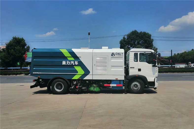 16方洗掃車_重汽豪沃T5G洗掃車功能特點:左、右高壓側噴桿與吸嘴“V”型布置,液壓操作收放,并可調整“V”形角度及高壓水噴嘴角度,水流沖擊力大,能高效匯集污水,并具噴桿有防撞和自動復位功能。能夠隨垃圾箱體舉升的動力倉罩可使動力系統的維修保養極為便利。洗掃車作業時先用邊刷將道牙處的垃圾向中間集中,再用高壓水進行清洗,然后由吸口將污水及垃圾吸到污水箱中。手持不銹鋼噴槍配快速接頭,能簡單地與沖洗卷盤連接或脫開。