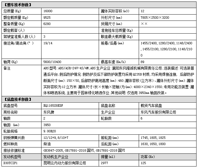 配置一:東風大福瑞卡F9系列駕駛室,3950mm軸距,云內德威170馬力(D30TCIF1)發動機,國六排放,8檔變速箱(高低檔),9.00R20鋼絲胎,原裝空調,電動窗,中控鎖,氣囊座椅,ABS,氣剎,方向助力;