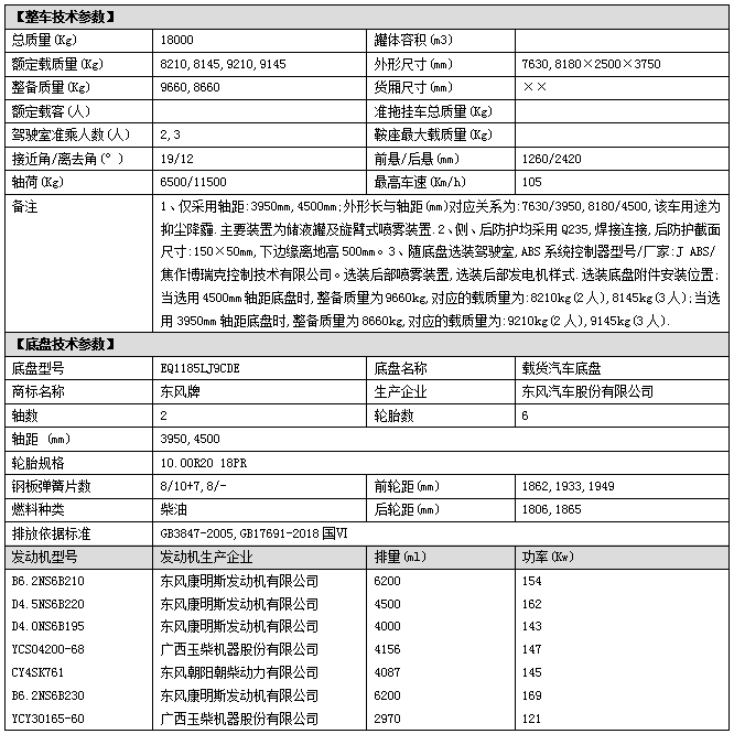 配置二:東風D9多利卡系列駕駛室,4500mm軸距,康明斯230馬力(B6.2NS6B230)發(fā)動機,法士特8檔變速箱,10.00R20鋼絲胎,空調電動窗,ABS,斷氣剎,方向助力;